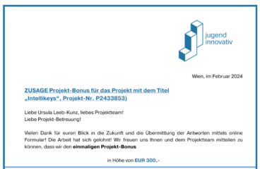 Weiterlesen ...Das Team von Intellikeysk kann sich über einen Projektbonus von € 300,-- freuen.