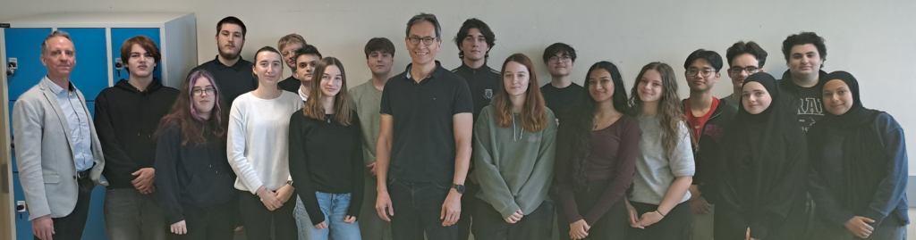 Zum Abschluss wurde ein gemeinsames Erinnerungsfoto mit Prof. Arndt und der 4AHBG aufgenommen. Der Besuch fand im Rahmen der Young Science Initiative der OeAD (Österreichs Agentur für Bildung und Internationalisierung) statt. Ziel dieser Initiative ist es, aktuelle Wissenschaft und Spitzenforschung direkt an Österreichs Schulen zu bringen, indem Wissenschafter und Forscher Schulen in ganz Österreich besuchen, Vorträge halten und Fragen der Schülerinnen und Schüler beantworten.